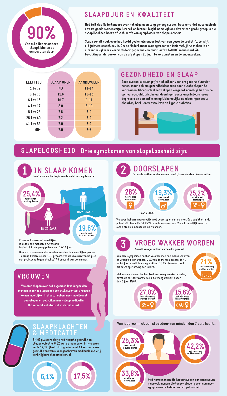 Nederlanders slapen over het algemeen lang genoeg, maar dat betekent niet automatisch dat we ook goede slapers zijn. Uit grootschalig meta-onderzoek in opdracht van de Hersenstichting blijkt dat een grote groep Nederlanders, met name vrouwen, slaapproblemen heeft. Nooit eerder is in ons land zo diep in de slaapcijfers gedoken, in totaal is slaapdata van maar liefst 140.000 mensen uit 34 bestaande Nederlandse bevolkingsonderzoeken van de afgelopen 25 jaar bekeken.
